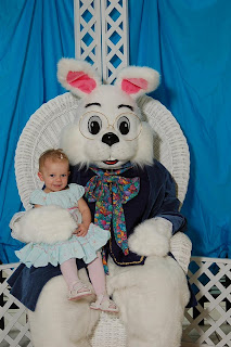 We weren't sure how the visit would go because she did not take to Santa Clause but we talked up the big bunny all day. We told her if she sat on his lap she could ride the train at the mall right after. So imagine my surprise when she walked right up and sat on the Easter Bunny's lap and smiled and said "cheese". Very cool. I finally got a decent picture with a Holiday Character. It was a good day. So Happy Easter everyone!